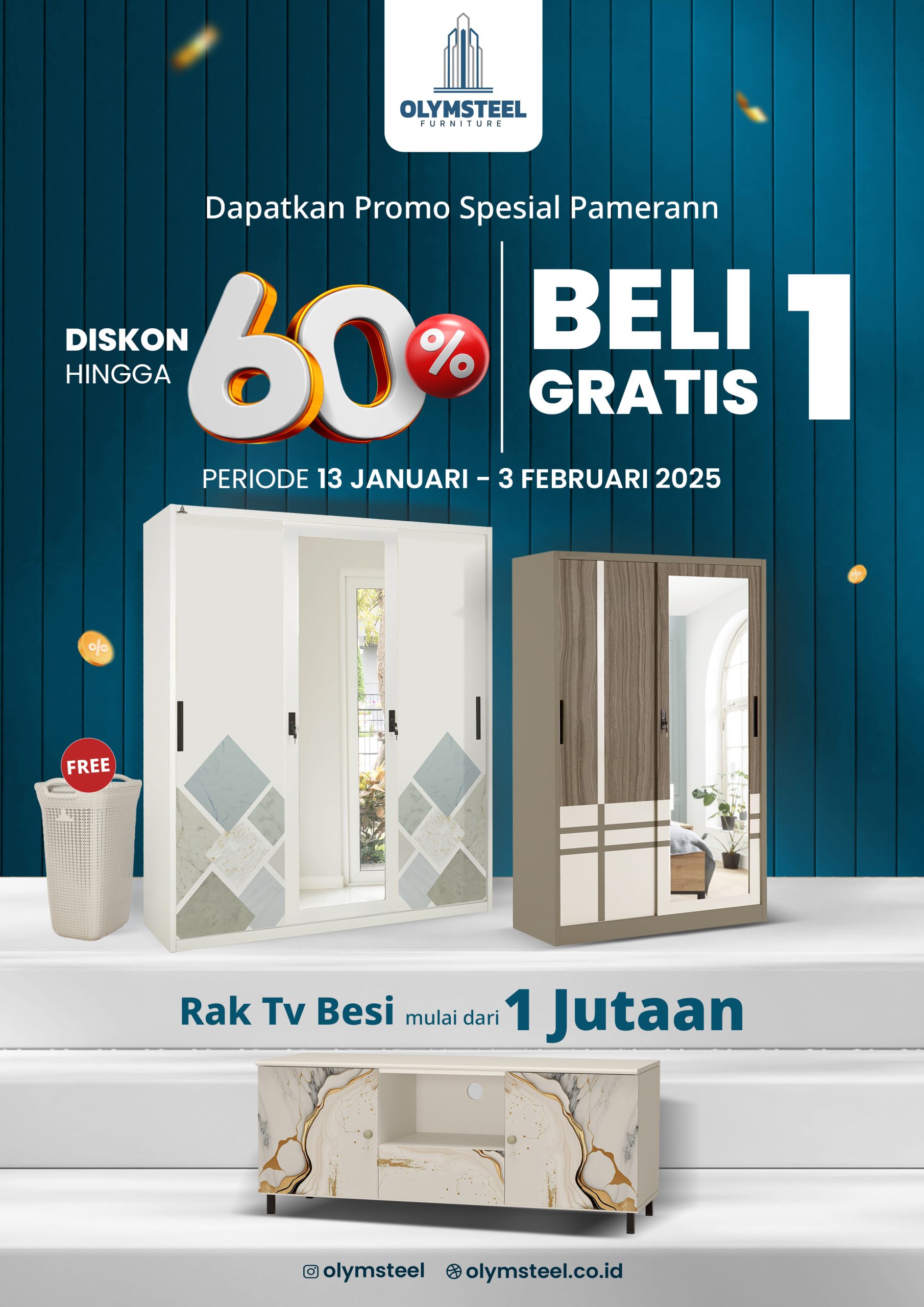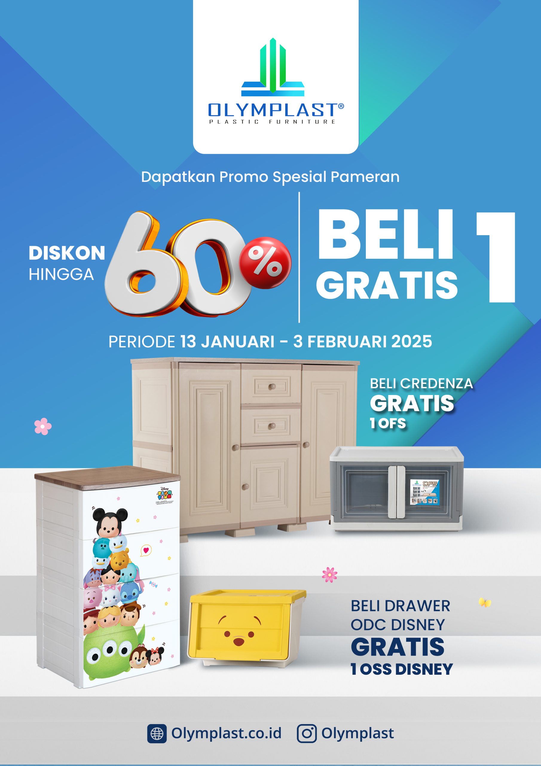 💫Diskon Hingga 60% ! 💫Lemari Besi mulai dari 2 jutaan 💫Rak TV dan Lemari sepatu besi mulai dari 1 jutaan Promo Buy 1 get 1 🌟 💫Lemari pakaian Besi 3P Free 1 unit OLB 💫Drawer plastik ODC 04 Series TsumTsum Free 1 unit OSS TsumTsum 💫OTC Credenza Free 1 unit OFS 📅 Periode: 13 Januari - 03 Februari 2025